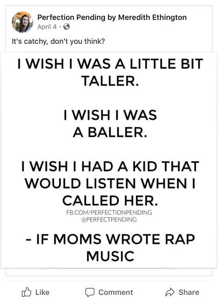Meredith Ethington is the founder and creator of Perfection Pending, and has been blogging for over 10 years. She is a mom to three, and is desperately trying to help her kids understand sarcasm, and her need for personal space. She recently turned Perfection Pending into a contributor site to share the voices of all the fellow moms she admires. She is a freelance writer and has her first book coming out soon, Mom Life: Perfection Pending. Follow her on Facebook, Instagram, and Twitter where she loves to laugh at herself and admit that while parenting is the best thing ever, it’s also the hardest job on earth.
